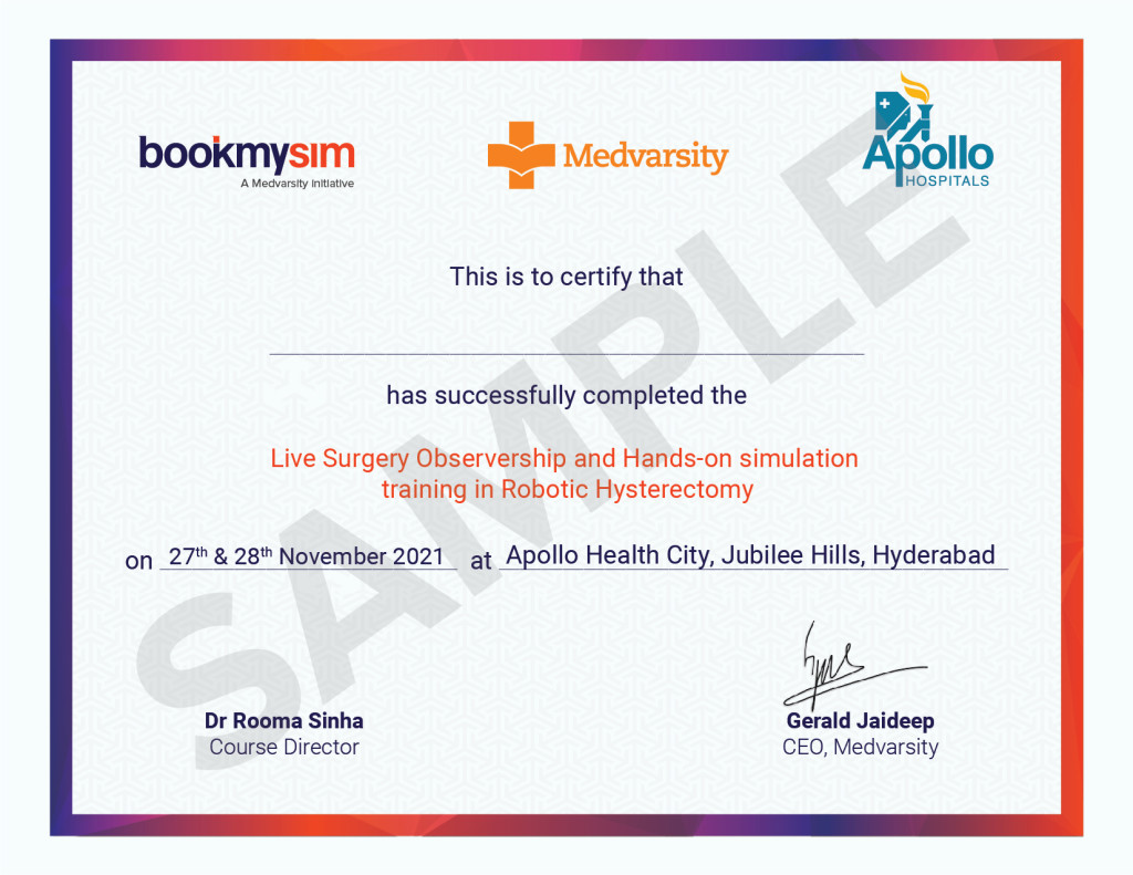 Get a total of 2 certificates - 1 participation certificate for the simulation workshop  from Apollo Hospitals & Medvarsity and 1 from Medvarsity for the online course  .
